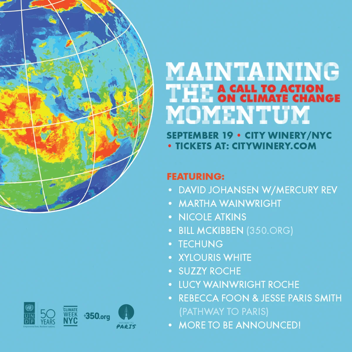 The UN Secretary General has called on countries to step up and ratify the Paris Agreement on climate change bySeptember 21st. Maintaining the Momentum is a call to action, highlighting the importance of making the Paris agreement real, featuring musicians, artists and policymakers all committed to tackling climate change. The time is now. Please join us for this very special evening of art, music and and forward thinking. We hope to see you there. All proceeds go to 350.organd the UNDP.